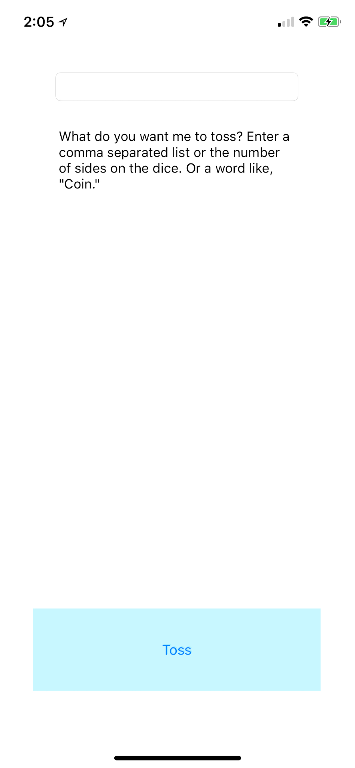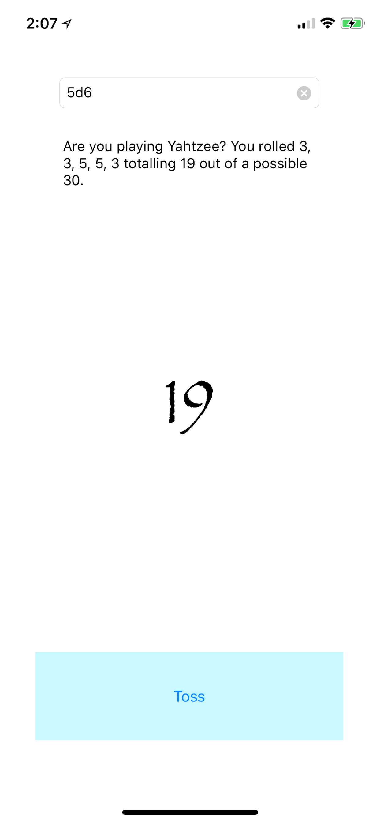 Toss dice? Enter a number for the number of die, followed by the letter 'd' and another number for the number of sides on the die, and iToss Randomizer will roll that number of that many sided dice. For example, when playing Yahtzee, you can start rolling '5d6' to get your first throw.