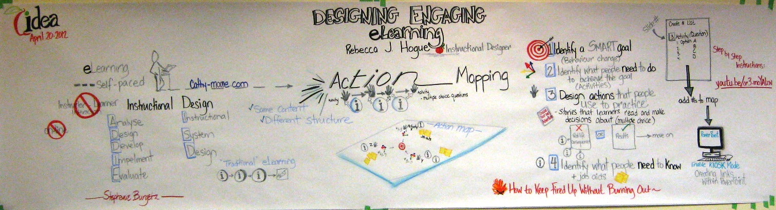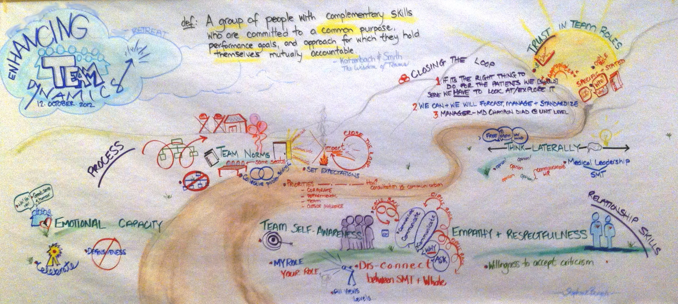 In the Fall of 2009 I attended a conference where a Graphic Recorder captured images on a large chart during the keynote presentations and a World Café that we participated in. I found the evolving charts to be quite poignant and was moved by the power of the visualizations to literally draw connections between ideas. I knew then that I wanted to learn more about the technique. This led me, in 2010, to The Grove Consultants International in San Francisco where I spent four days learning, practising and being coached to include the incorporation of graphic facilitation into my organizational development practice. Working in a visual way keeps me energized and inspires me. It has become my passion.